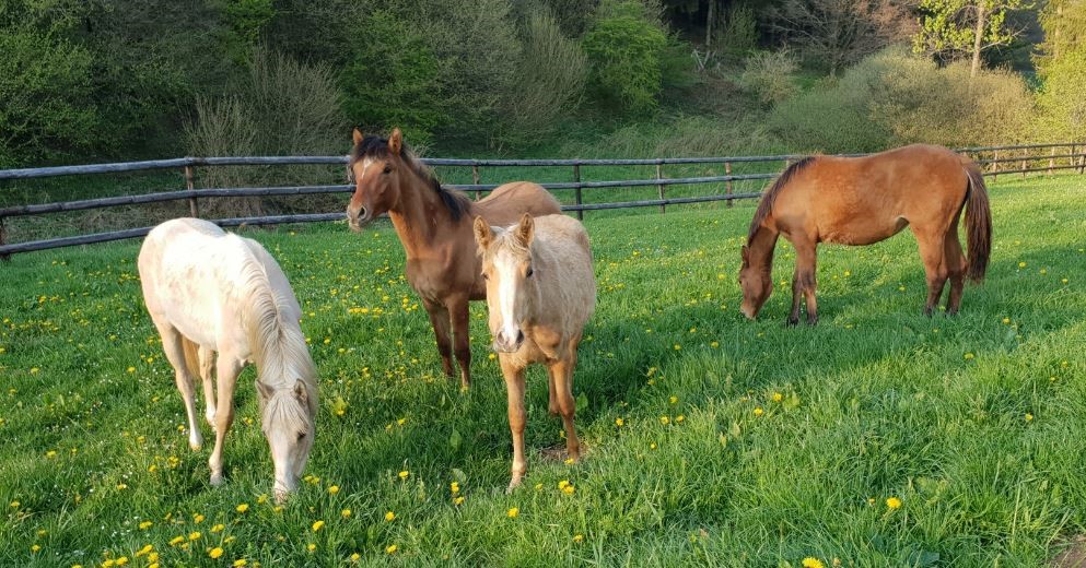 Die jungen Fohlen des Jahrgangs 2018 genießen die saftigen Wiesen und freuen sich, daß der Winter vorbei ist.