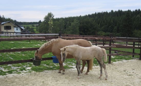 Carmelita und ihr Hengstfohlen auf dem Weg zur Weide. Der Offenstall und sein großzügig angelegter Paddock bieten Schutz vor Wetter und Sonne.