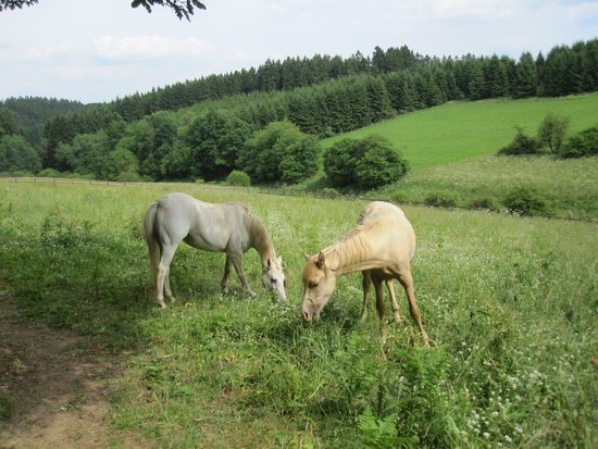 Saftige Weiden, genügend Schatten : die erfahrene Stute Samba und unser Goldjunge Dakar geniessen die gesunde Eifelluft.