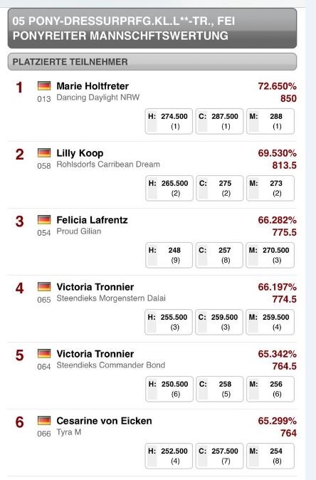 Bei der FEI Pony-Dressurprüfung Klaase L am 01.02.2020 in Lübeck konnte Victoria Tronnier mit Morgensterns Dalai auf einem sehr guten 4. Platz voll überzeugen. Victoria hat sich somit auch für den Landeskader Schleswig-Holstein qualifiziert.